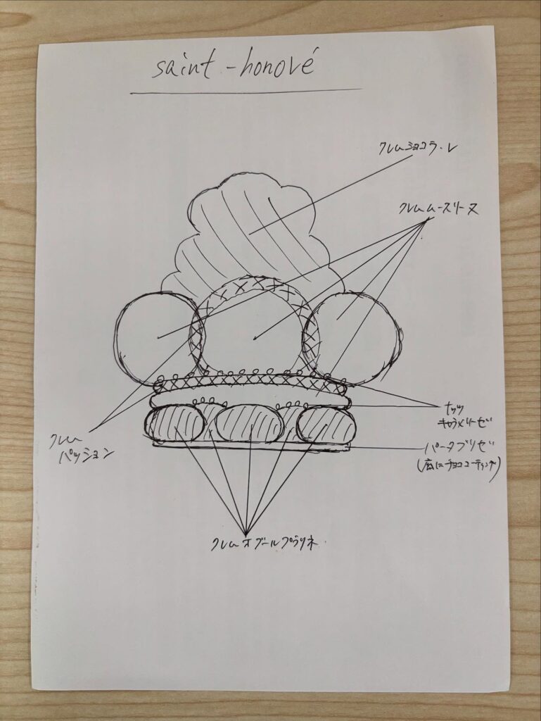 サントノーレというフランスの伝統菓子で、パイ生地の上にクリームを絞り、シュークリームを飾りつけたケーキです。
