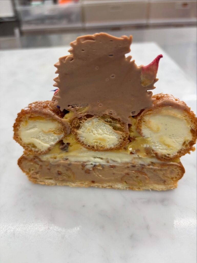 クリームは、バタークリームとカスタードを混ぜ合わせた「ムースリーヌ」、ナッツのペーストを混ぜ込んだ「プラリネクリーム」、味のアクセントになる「パッションクリーム」、味の主軸となる「ミルクチョコクリーム」で構成されていてナッツのキャラメリーゼを砕いものも忍ばせています。