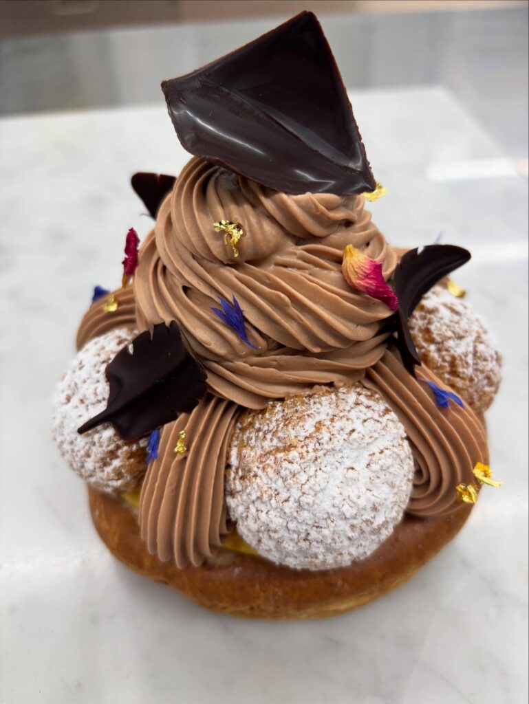 この形は公爵の王冠をイメージしていてフランスでは特別な日に食べるケーキとしてとても知名度のあるケーキで、ララショコラのアレンジで仕上げました。